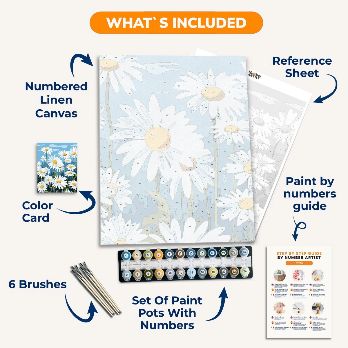 Find your inner peace with Elysian Daisy Field! Use our paint by numbers kit to create a serene scene of different sized daisies amidst majestic mountains and a breathtaking blue sky. Relax and unwind while painting, perfect for meditation. Let the beauty of nature inspire your artistic creation!